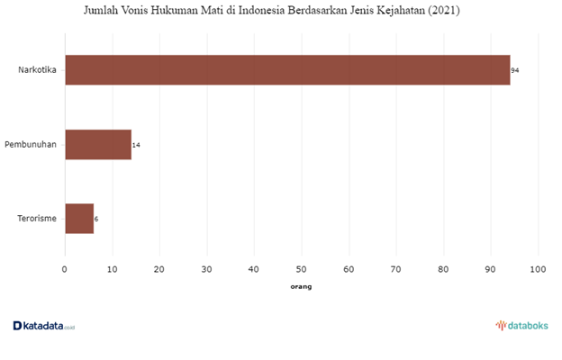 Selama periode Januari-Desember 2021 terdapat 114 orang yang telah divonis hukuman mati di Indonesia dengan rincian 94 akibat kasus kejahatan narkotika, 14 kasus pembunuhan, dan 6 kasus terorisme. Dari jumlah vonis hukuman mati tersebut, 82% di antarannya dijatuhkan kepada pelaku kejahatan narkoba.