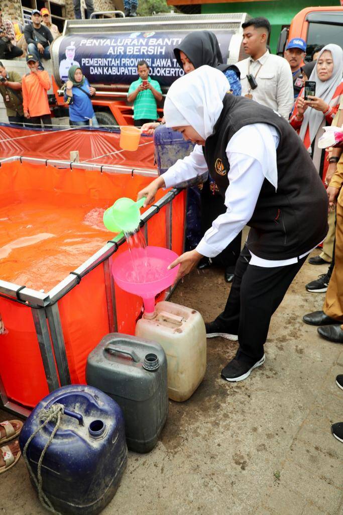 Setibanya di lokasi, Gubernur Khofifah dengan didampingi Bupati Mojokerto Ikfina Fahmawati, memastikan bahwa proses distribusi air bersih menggunakan mobil tangki kapasitas 4.000 liter berjalan dengan baik. Bahkan, ia juga berkesempatan langsung mengisi sendiri jerigen-jerigen yang dibawa masyarakat untuk mengambil air bersih dari mobil tangki.