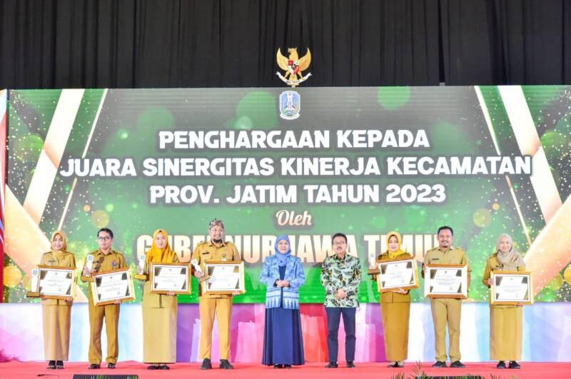 Surabaya, Radar96.com – Gubernur Jawa Timur Khofifah Indar Parawansa memberikan penghargaan kepada para camat berprestasi di Bumi Majapahit yang terpilih menjadi Juara Sinergitas Kinerja Kecamatan (SKK) dalam gelaran Rapat Pembinaan Kecamatan Provinsi Jawa Timur tahun 2023, di Dyandra Convention Center, Selasa (12/12).