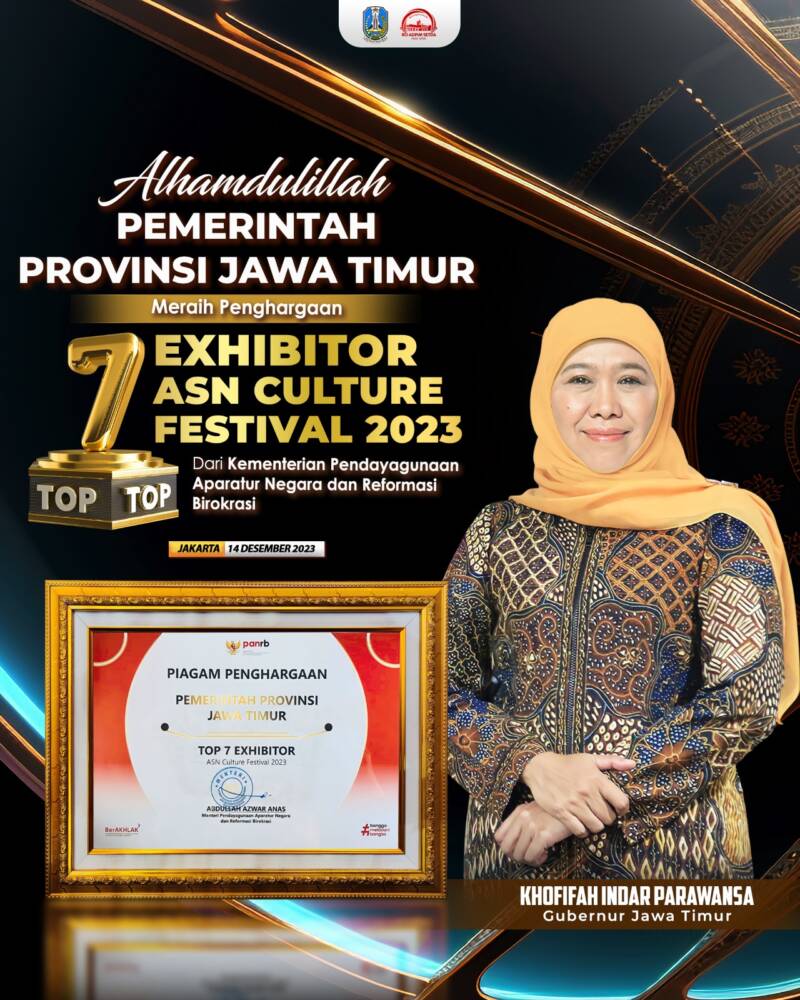 Surabaya, Radar96.com – Pemerintah Provinsi Jawa Timur menerima penghargaan “Top 7 Exhibitor dalam ASN Culture Fest 2023” dari Kementerian Pendayagunaan Aparatur Negara dan Reformasi Birokrasi (KemenPAN-RB) RI. Penghargaan ini ketiga kali berturut-turut berhasil diraih Jawa Timur sejak dilaksanakan ASN Culture Fest tahun 2021.