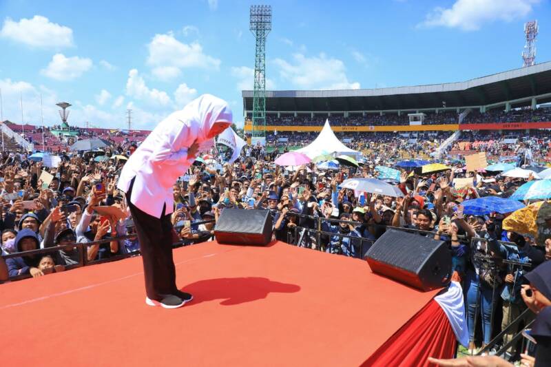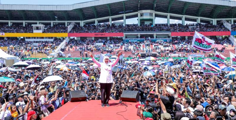 “Kalau berkumpul tertib dan rapi, Gelora Delta kita pilih hari ini. Selamat hari jadi untuk SPSI, Teruslah bersatu untuk membangun negeri,” ajak Khofifah.