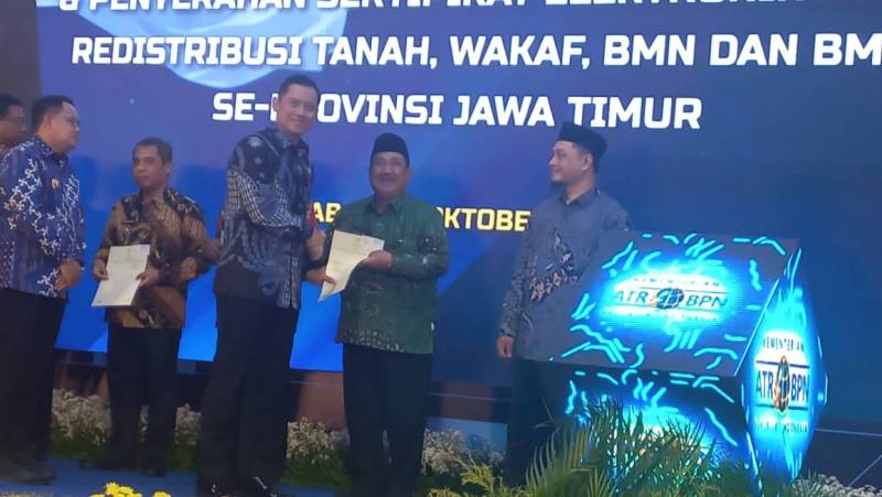 Pada hari Selasa (8/10/2024), sertifikat diserahkan langsung oleh Menteri ATR/BPN Agus Harimurti Yudhoyono (AHY) kepada Ir. H. Maduqi Thoha selaku Ketua PCNU Surabaya di Gedung negara Grahadi Surabaya, Selasa (8/10/2024).