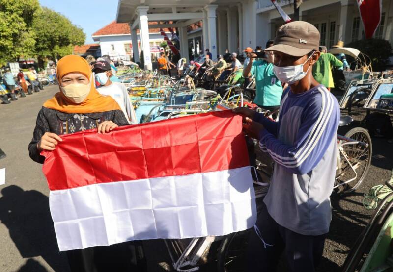 Secara khusus, Gubernur Khofifah membagikan bendera merah putih satu per satu pada tukang becak. Sembari membagikan bendera, Gubernur Khofifah juga memesankan agar bendera tersebut dikibarkan satu tiang penuh.