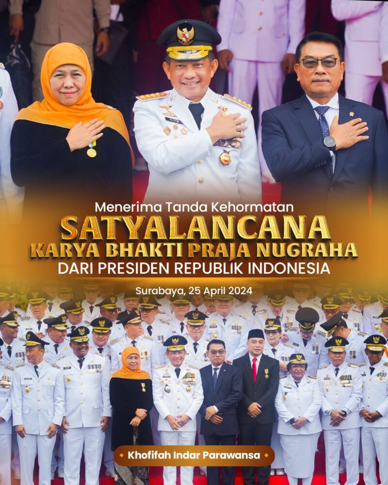 Sebagai informasi, Dari 15 orang penerima Satyalancana Karya Bhakti Praja Nugraha tahun 2024, Khofifah menjadi satu-satunya gubernur yang menerima penghargaan paling bergengsi di kalangan kepala daerah tersebut. Hal ini karena Jatim menjadi provinsi berkinerja terbaik berturut turut.