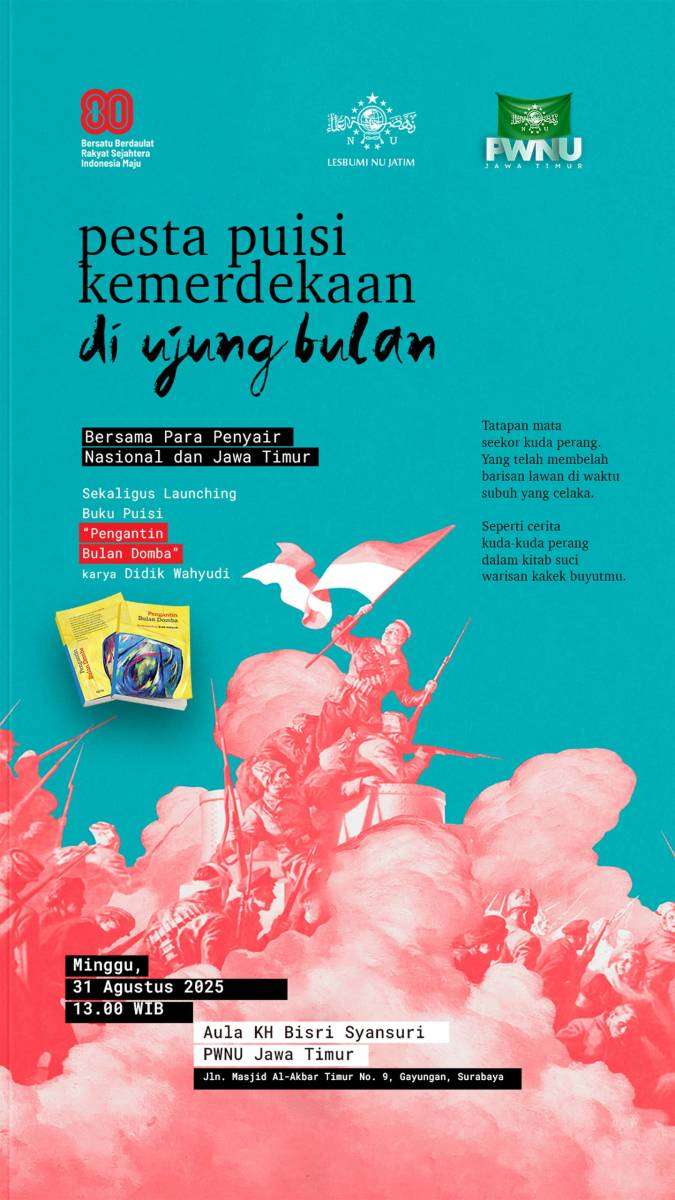 Surabaya, radar96.com – Lembaga Seni Budaya Muslimin Indonesia (LESBUMI) PWNU Jawa Timur menggelar acara “Pesta Puisi Kemerdekaan di Ujung Bulan” di Aula KH Bisri Syansuri, PWNU Jawa Timur, Surabaya, pada 31 Agustus 2025, pukul 13.00 WIB.