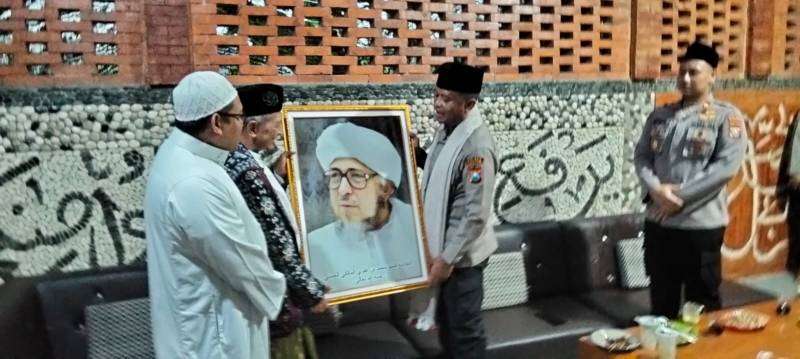 Pengasuh Pesantren Al Azhaar Kedungwaru, KH Imam Mawardi Ridlwan, pada tampak menyambut dengan memberikan kalung sorban kepada Kapolres sebagai tanda kebersamaan keluarga besar pesantren.