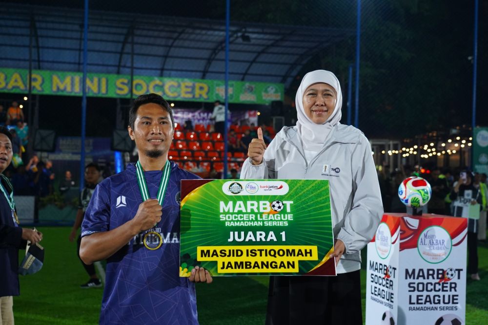 “Al-Aqlus Salim fil Jismis Salim. Akal/jiwa yang sehat terdapat pada tubuh/jasmani yang sehat. Terima kasih kepada Masjid Istiqomah Jambangan yang telah membangun penguatan masjid melalui olahraga, terima kasih kepada Masjid Al-Akbar yang menjadi inisiator Marbot Soccer League,” kata Gubernur Khofifah.